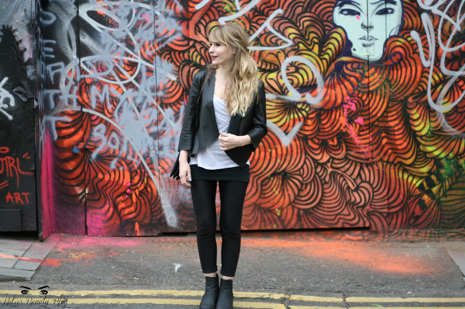 I threw it on top of a white long top and black vest (I love vests and layering) and with my American Apparel Shiny Black Leggings on bottom. I purchased these as I wanted a pair of disco type pants without the tightness around the waist (surely not the only girl who feels like this) which I can throw on under any long top. I adore them and practically live in them. My boots are from New Look (available here) and they’re ridiculously comfortable and are easy to walk in even with a bit of height.