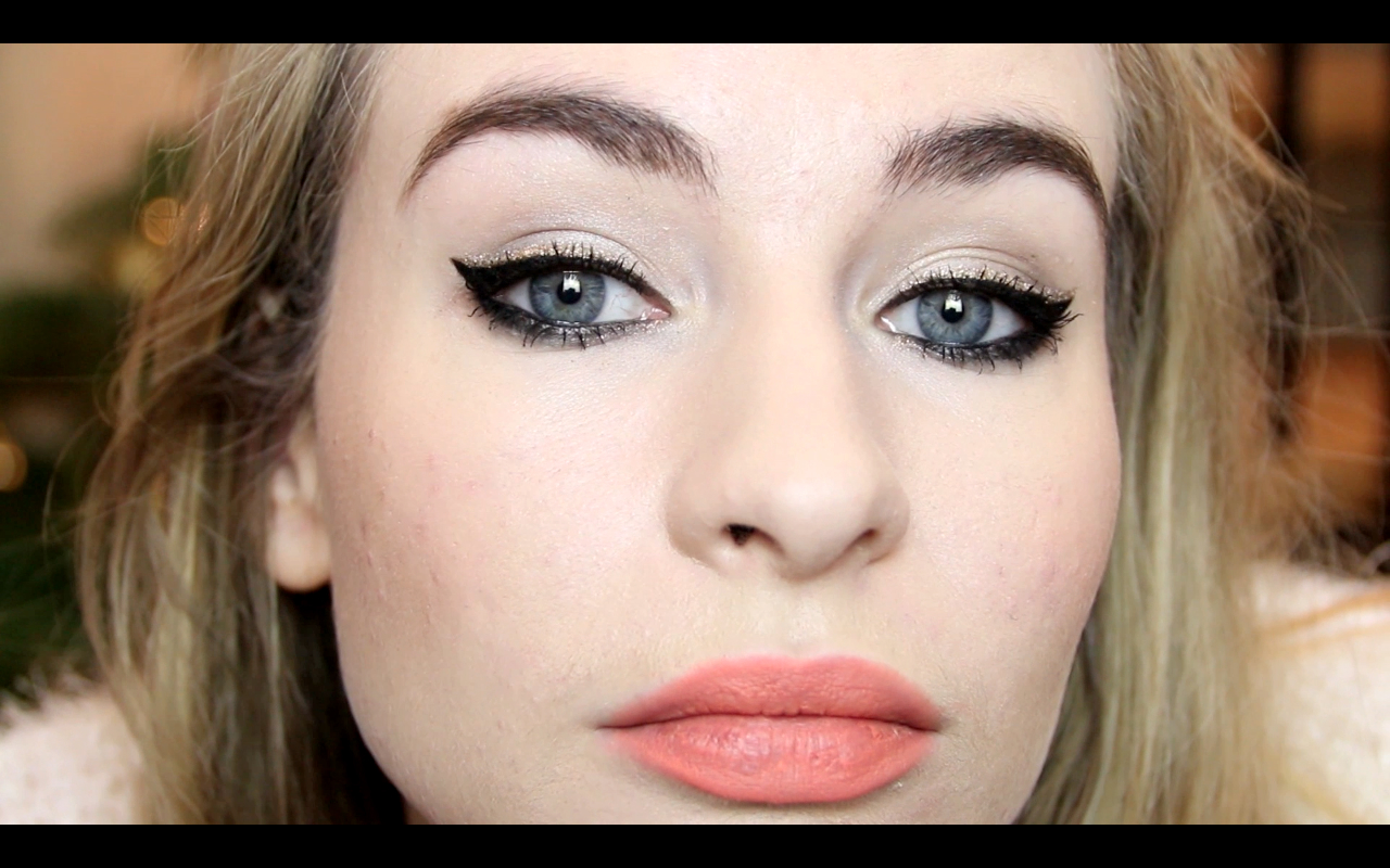 I tried to use really affordable and easy to find products to create the ‘eye’ for this look so I opted for a Rimmel Quad for shadows and Collection Products to create the glitter.  You can also obviously switch up the glitter colour for this look but I think gold and black is classic and makes the perfect New Year’s Eve makeup!